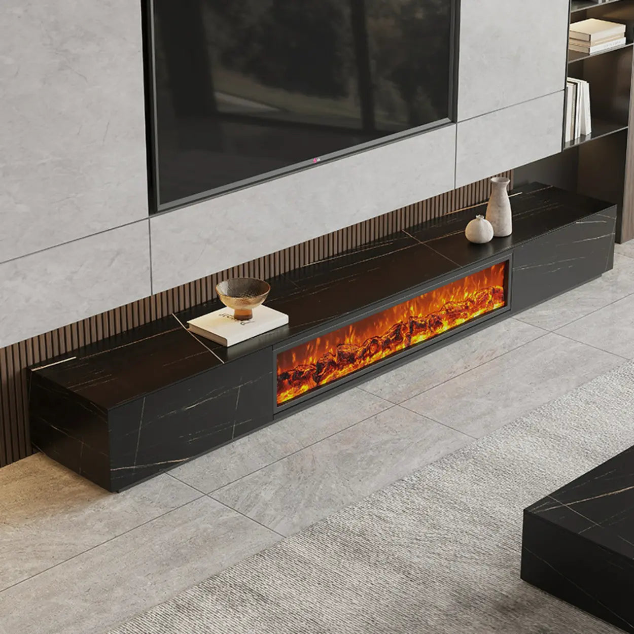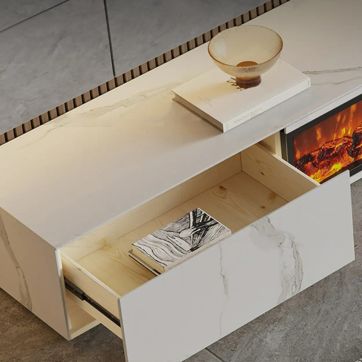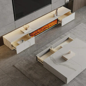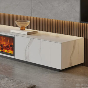 Dieser moderne TV-Schrank kombiniert Marmoroptik, Kaminbeleuchtung und LED-Licht zu einem schicken Zentrum fürs Wohnzimmer. Die Oberfläche zeigt ein ruhiges Marmordesign. Es wirkt edel, ohne laut zu sein. Die Struktur ist matt und angenehm glatt. Der integrierte Elektrokamin erzeugt ein warmes Flammenbild. Das Licht flackert ruhig und schafft abends sofort Atmosphäre. Die LED-Beleuchtung setzt zusätzliche Akzente und macht das Möbel optisch leichter.