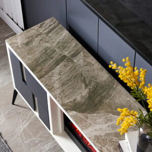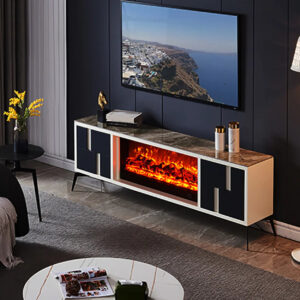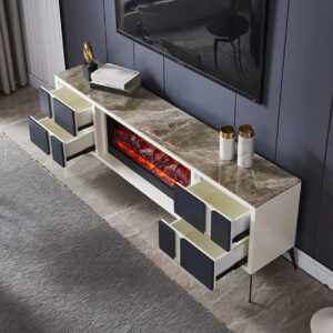 Dieser moderne TV-Schrank kombiniert klare Linien mit einer warmen Lichtwirkung. Die Front zeigt eine Steinoptik, die ruhig wirkt und ohne Muster auskommt. Die integrierte Kaminbeleuchtung verleiht dem Möbel eine sanfte Atmosphäre. Das Licht wirkt nicht kitschig, sondern dezent und gleichmäßig. Dadurch entsteht ein angenehmer Effekt, besonders abends.