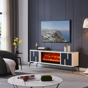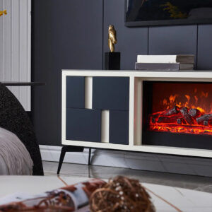 Let’s break it down. Der Schrank bietet Stauraum für Receiver, Konsole oder Zubehör. Die Ablagen sind übersichtlich und stabil. Die Oberfläche bleibt widerstandsfähig gegen Kratzer und lässt sich leicht reinigen. Der mittlere Bereich zeigt die Kaminbeleuchtung hinter einer klaren Abdeckung. Diese Beleuchtung arbeitet stromsparend und sicher, da sie keine Hitze erzeugt.